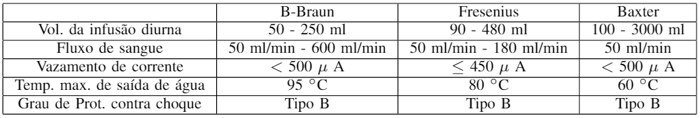 Para uma melhor compreensão dos mecanismos e especificações de entrada e transdução de máquinas de hemodiálise, buscou-se três grandes fabricantes, são eles: B-Braun, Fresenius e Baxter [2, 3, 4]. Embora sejam de marcas diferentes, todas as máquinas possuem as especificações de entrada comum, isto é, todas possuem o sangue como elemento de entrada à ser filtrado. Um dos elementos fundamentais encontrado nesses equipamentos é a bomba peristáltica, uma bomba capaz de bombear o sangue sem entrar em contato com o mesmo, pois se tratando de sangue humano, não pode haver qualquer tipo de contaminação, até mesmo da própria bomba. Assim sendo as máquinas de hemodiálise em momento algum entra em contato com o paciente, porém ela pode ser utilizada mais de uma vez pelo mesmo paciente, desde que este não seja soropositivo para a Aids, pois caso seja a máquina deve ser utilizada uma única vez e depois de ser utilizada deverá passar por um processo de lavagem e esterilização. No caso do uso do equipamento por mais de um paciente, deve haver a lavagem e esterilização da máquina após cada procedimento.