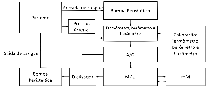 A máquina tem como função principal realizar a filtragem do sangue e, também, a eliminação de líquidos de pacientes com insuficiência renal. Para isso há uma série de sensores que realiza a monitoramento do paciente e no equipamento pré, pós e durante o procedimento, tais como pressão arterial, temperatura do fluído, vazão do fluído, condutividade do fluído etc. Sensores, como por exemplo o esfigmomanômetro para medição da pressão arterial, são ligados diretamente no paciente, outros são conectados junto à bomba peristáltica, por exemplo o fluxômetro. Todas as grandezas mensuradas são então discretizadas e enviadas ao microcontrolador (MCU) que as processa e envia para o painel de interface homem máquina (IHM), além de controlar o dialisador comparando os sinais recebido dos sensores e os valores setados pelo operador através da IHM. O dialisador por sua vez realiza o filtro do sangue e retorna-o para o paciente através da bomba peristáltica. Da mesma forma que o fluxo vindo do paciente é monitorado o fluído que sai do dialisador também é verificado.